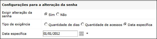 Se desejar que os usuários alterem suas senhas no dia 01/01/2012, preencha os campos da seguinte maneira: